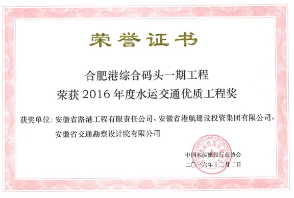 近日,安徽路港公司承建的合肥港綜合碼頭一期工程榮獲2016年度中國水運交通優(yōu)質工程獎,該獎項為全國水運行業(yè)最高工程質量獎。安徽路港公司首次獲得該獎,也是安徽省首個項目獲此殊榮。