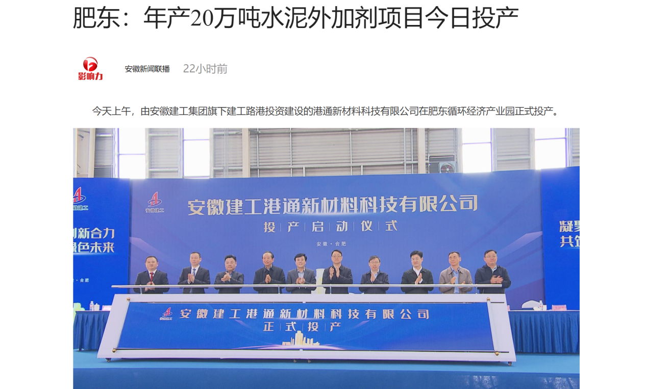 近日,安徽新聞聯(lián)播、合肥新聞聯(lián)播對(duì)安徽建工港通新材料科技有限公司投產(chǎn)啟動(dòng)儀式進(jìn)行報(bào)道。