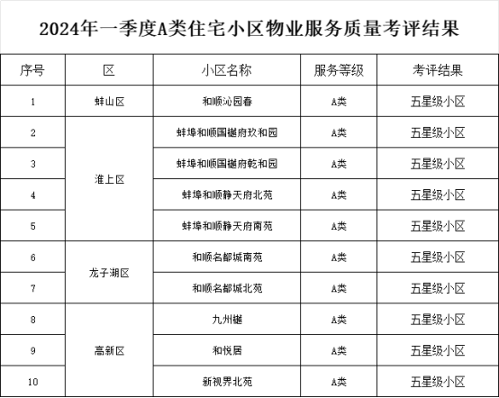 近日,由蚌埠市住建局、相關(guān)物業(yè)行業(yè)專家組成的考評(píng)小組,對(duì)蚌埠市住宅物業(yè)開展了2024年一季度服務(wù)質(zhì)量考評(píng)工作。在蚌山區(qū)、淮上區(qū)、龍子湖區(qū)、高新區(qū)質(zhì)量考評(píng)中,安徽建工新時(shí)代物業(yè)管理有限公司A類(服務(wù)等級(jí))住宅項(xiàng)目全部榮獲五星級(jí)小區(qū)榮譽(yù)稱號(hào),在蚌埠市場(chǎng)穩(wěn)扎第一方陣。
