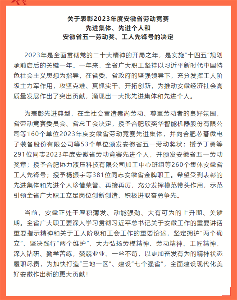 4月28日,安徽省總工會(huì)發(fā)布《關(guān)于表彰2023年度安徽省勞動(dòng)競(jìng)賽先進(jìn)集體、先進(jìn)個(gè)人和安徽省五一勞動(dòng)獎(jiǎng)、工人先鋒號(hào)的決定》,公司喜獲“安徽省勞動(dòng)競(jìng)賽先進(jìn)集體”榮譽(yù)稱號(hào)。
