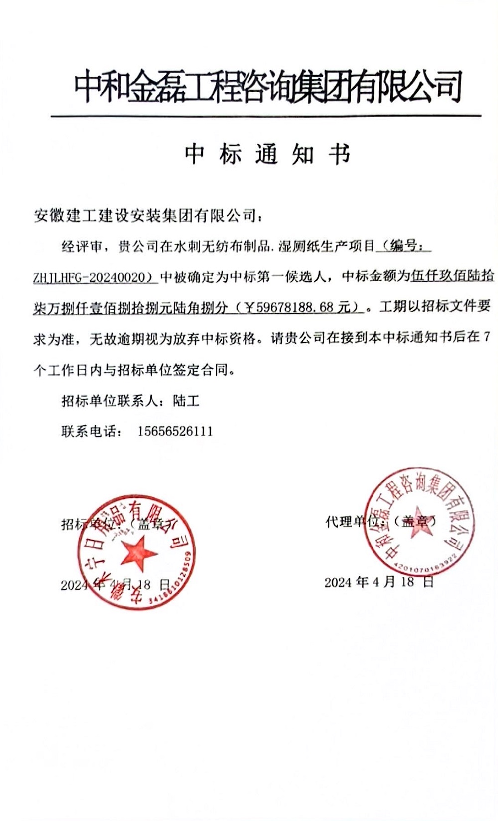 再傳喜訊!建工安裝中標(biāo)安徽禾寧日用品有限公司水刺無紡布制品廠房建設(shè)項(xiàng)目,合計(jì)中標(biāo)金額5968萬元。