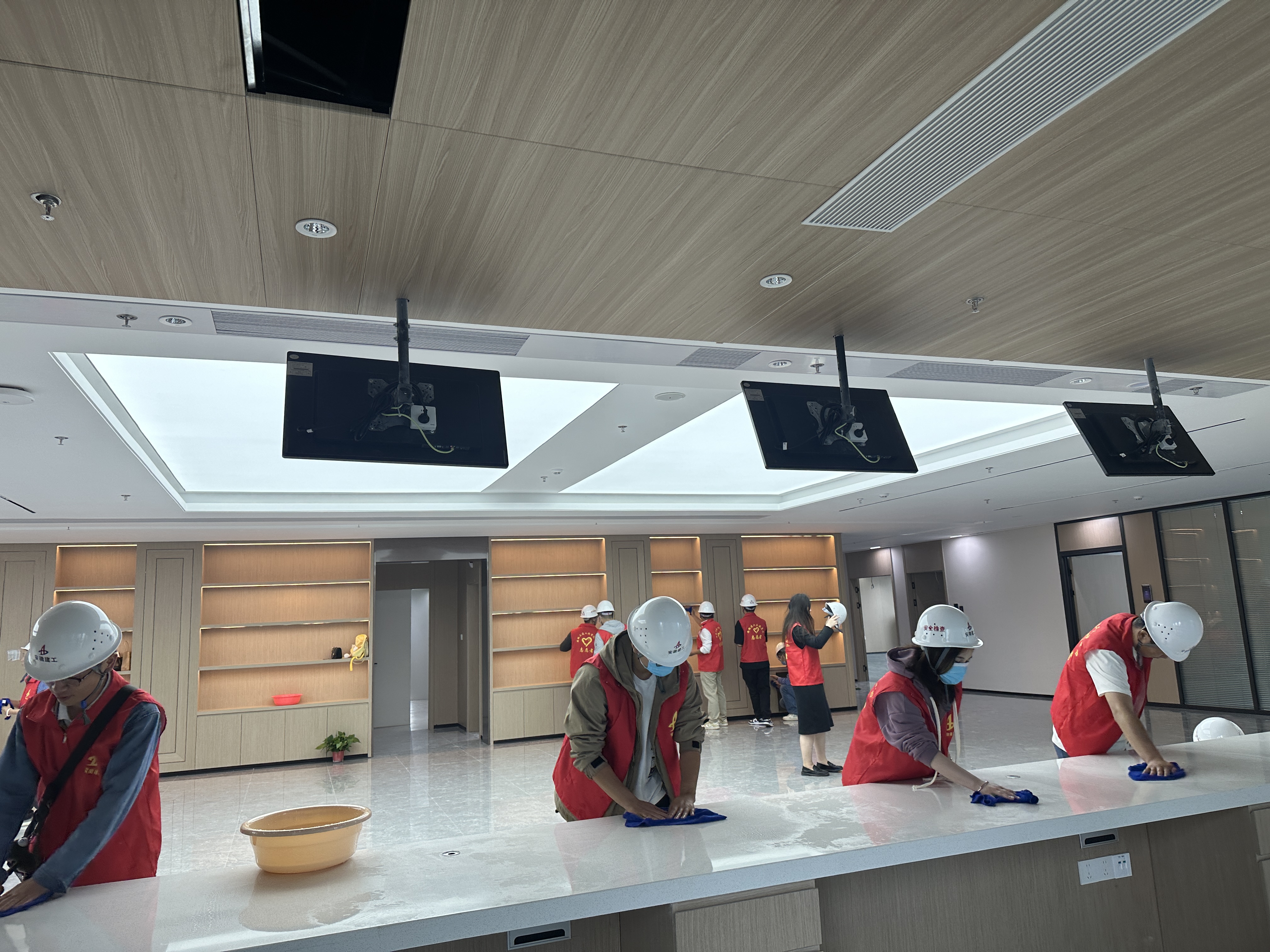 青年團干和團員聽取了項目建設(shè)總體情況介紹后,有序參觀了大廳及各樓層主要空間,施工現(xiàn)場的安全管理、環(huán)境保護、質(zhì)量通病控制、細部處理以及智能建造等給大家留下了深刻的印象,為青年職工提供了一個寶貴的學習機會和提升業(yè)務(wù)水平、拓寬視野的良好平臺。參觀結(jié)束后,大家在項目現(xiàn)場開展了青年職工志愿大掃除活動,助力項目順利完成收尾工作。志愿者們充分發(fā)揮不怕臟、不怕累的精神,熱情洋溢地進行勞動,包括窗戶玻璃和室內(nèi)設(shè)施擦洗、地板清掃等,展現(xiàn)了志愿者們陽光向上、精神飽滿的良好狀態(tài)。