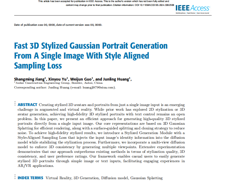 近日,安徽建科總承包分院撰寫(xiě)的《從單個(gè)圖像快速生成具有樣式對(duì)齊采樣損失的3D風(fēng)格化高斯肖像》SCI論文通過(guò)審核,并且在最新一期的IEEE Access期刊上發(fā)表,出版日期為2024年4月23日。