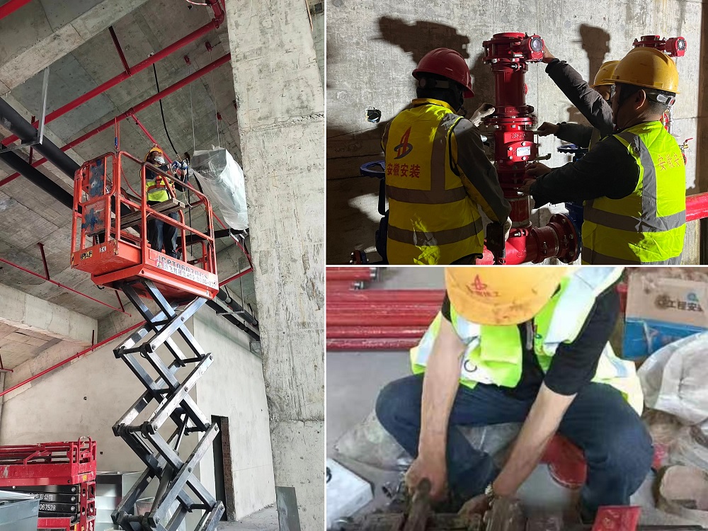 圖為電氣班組穿線、消防班組濕式報(bào)警閥安裝、消防班組管道預(yù)制