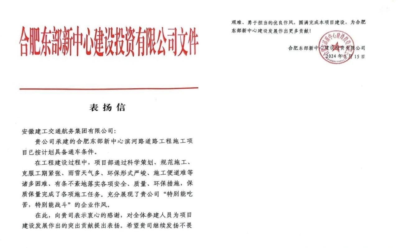 濱河路道路工程施工項(xiàng)目位于合肥市瑤海區(qū)東部新中心,2023年7月開(kāi)工,項(xiàng)目建成后,將進(jìn)一步緩解城區(qū)交通壓力。5月15日,合肥市東部新中心建設(shè)投資有限公司向公司發(fā)來(lái)表?yè)P(yáng)信,對(duì)項(xiàng)目部攻克工期緊張、環(huán)保形勢(shì)嚴(yán)峻、施工便道不暢等諸多難題,保質(zhì)保量完成施工任務(wù)提出表?yè)P(yáng)。