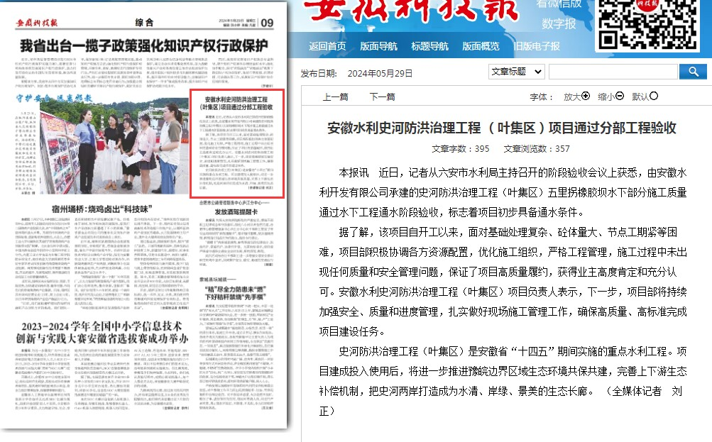 近日,安徽水利承建的史河防洪治理工程(葉集區(qū))項(xiàng)目順利通過(guò)水下工程通水階段驗(yàn)收,得到業(yè)主高度認(rèn)可,受到安徽科技報(bào)、美麗安徽欄目關(guān)注報(bào)道。