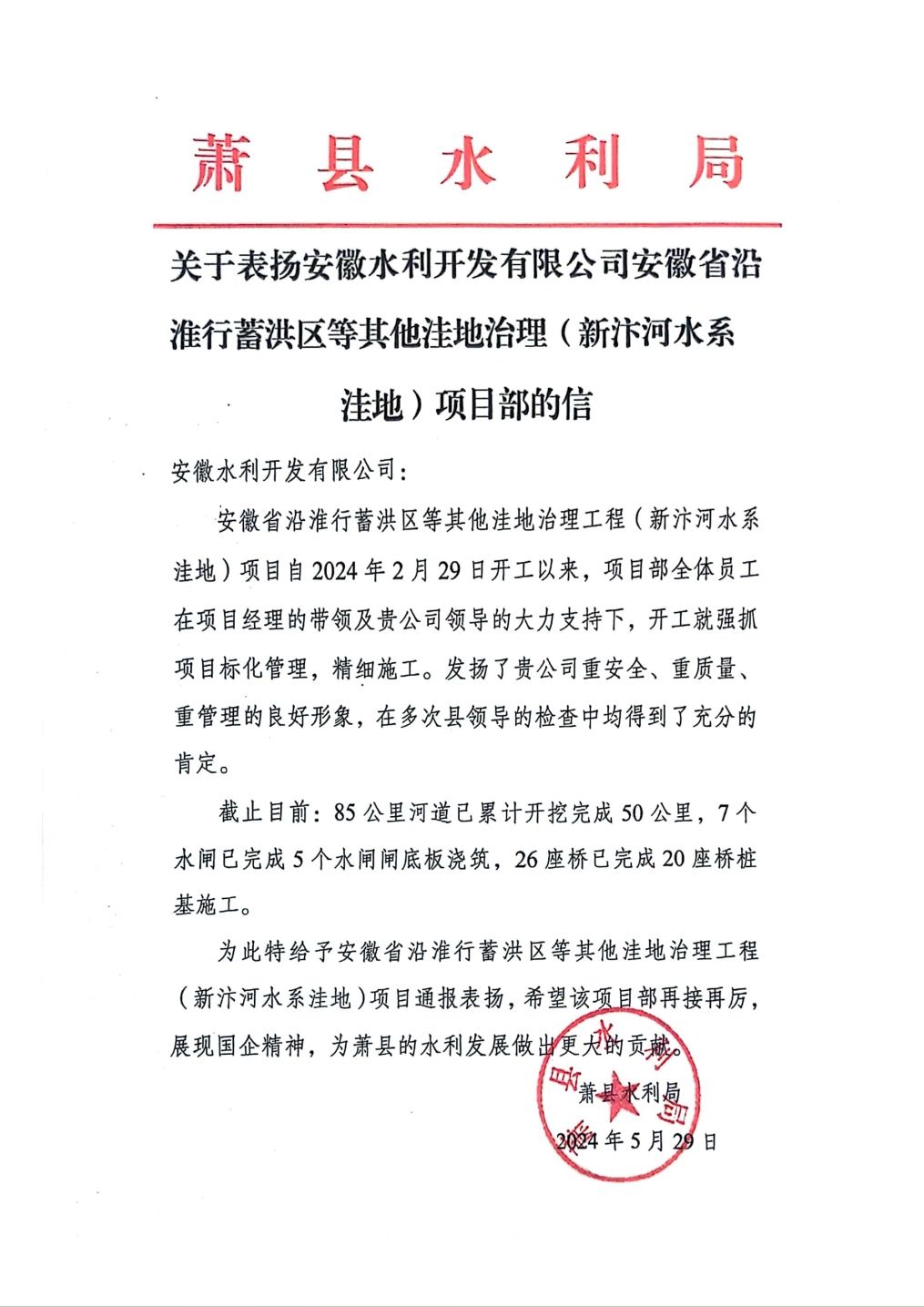 近日,安徽水利承建的安徽省沿淮行蓄洪區(qū)等其他洼地治理工程(新汴河水系洼地)項(xiàng)目部收獲業(yè)主單位發(fā)來的表揚(yáng)信,對項(xiàng)目標(biāo)準(zhǔn)化管理表示高度贊揚(yáng)。