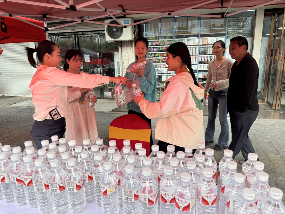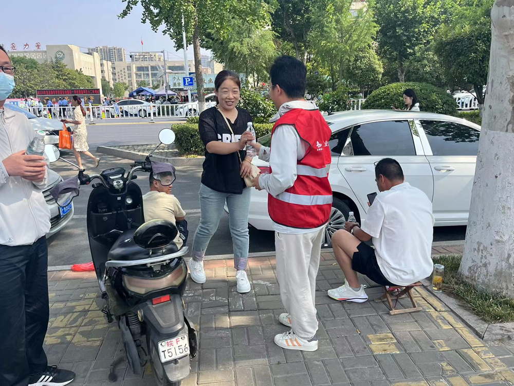 淮北項目的志愿服務小隊早早來到現(xiàn)場,為考生和家長免費提供飲用水、紙扇等。志愿者們用微笑和鼓勵,為考生們加油打氣,緩解他們的緊張情緒。