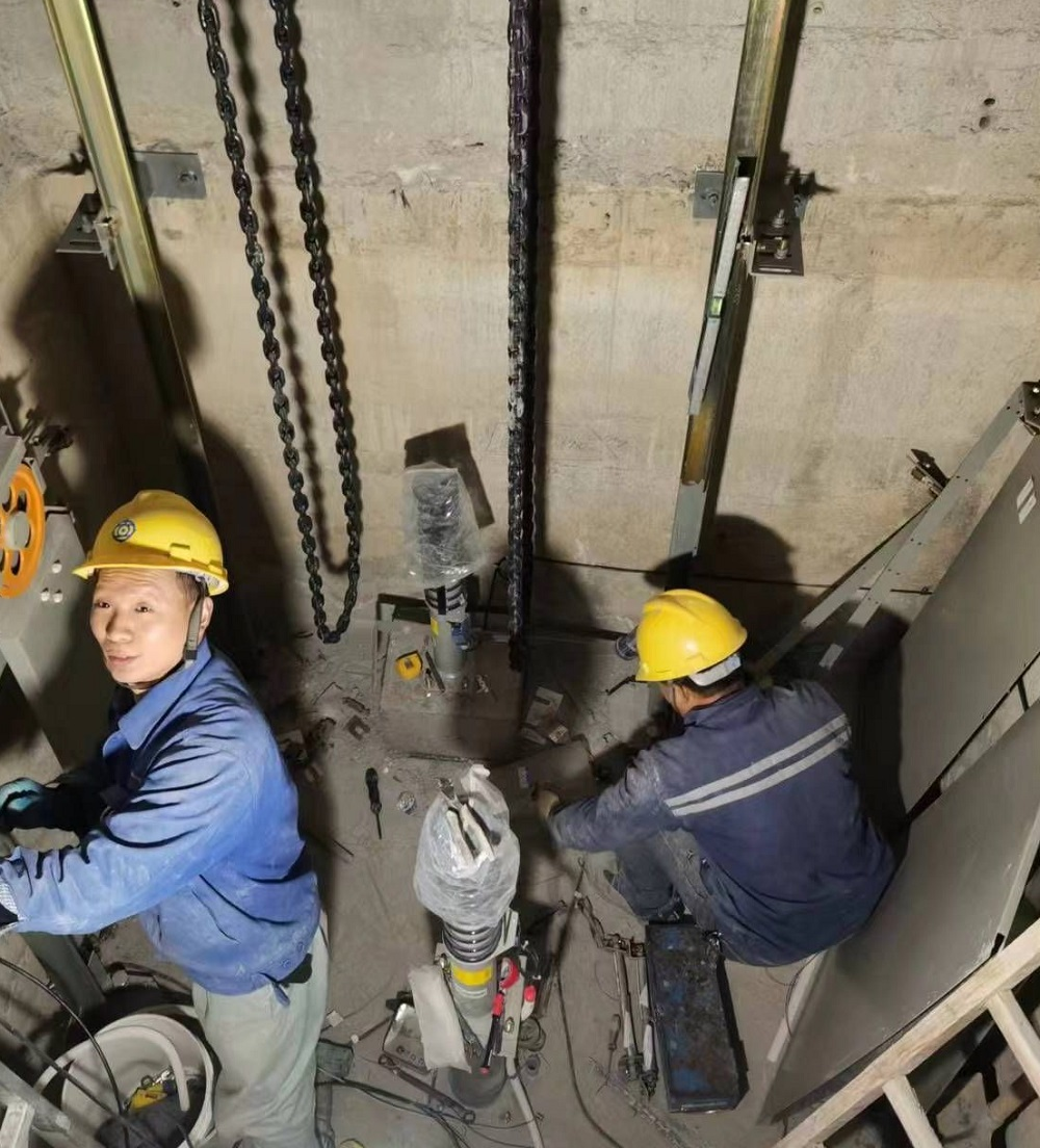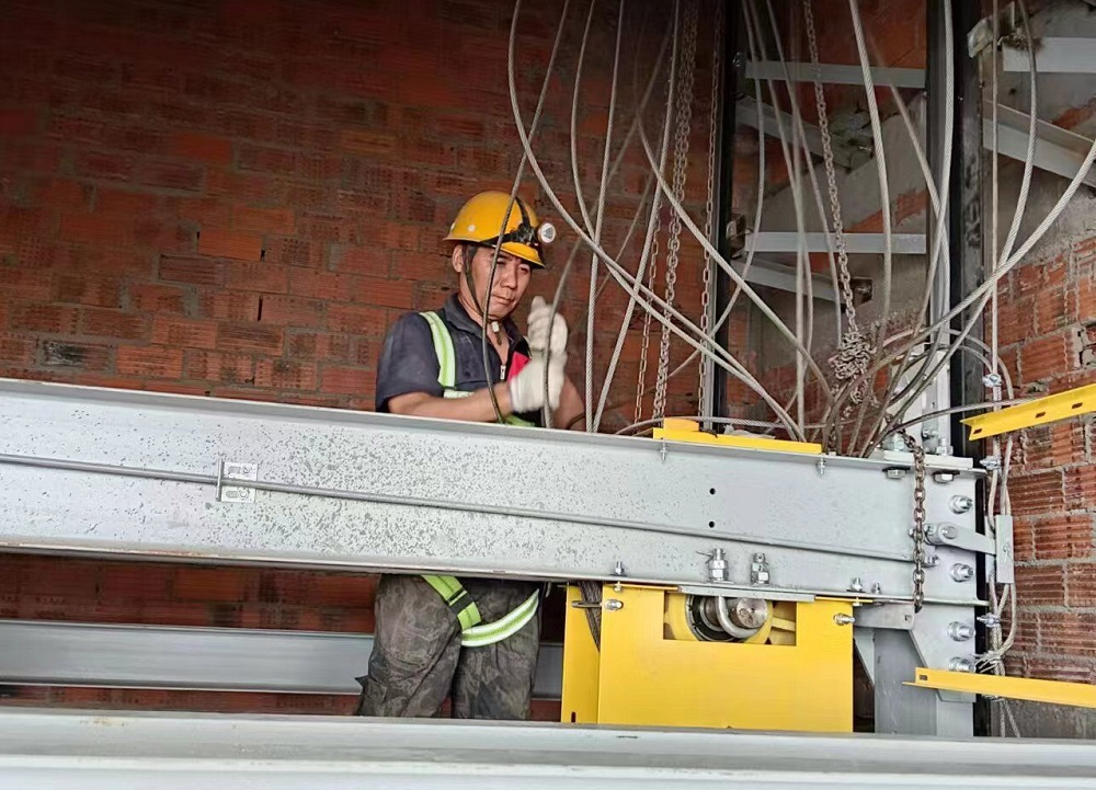 長三角一體化中新蘇滁高新區(qū)高端智能制造產(chǎn)研基地項目現(xiàn)場安裝人員正在收緊鋼絲繩、調(diào)整電梯緩沖距離