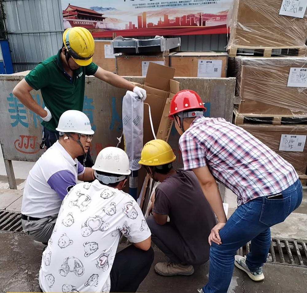 安徽大學綠色產(chǎn)業(yè)創(chuàng)新基地項目現(xiàn)場安裝人員正在進行電梯開箱檢驗