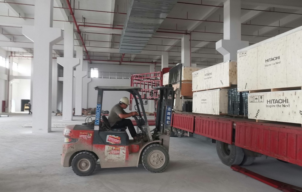 臨港科創(chuàng)園項目現(xiàn)場安裝人員正在進行電梯卸貨