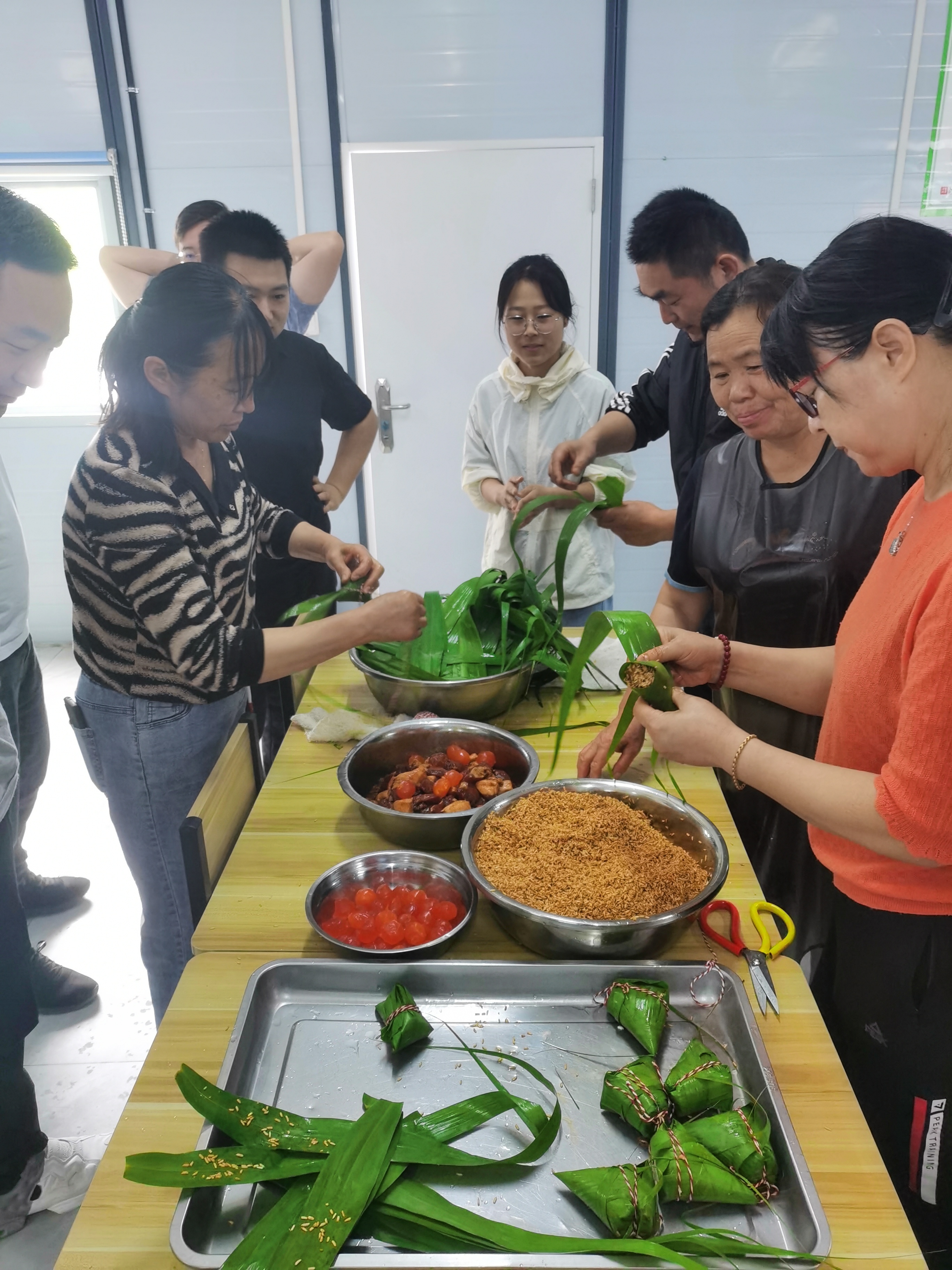 合肥理工學院項目組織管理人員包粽子,項目管理人員齊上陣,不一會,一個個翠綠誘人的粽子就呈現(xiàn)在大家眼前,項目部一派歡樂溫馨的氛圍。