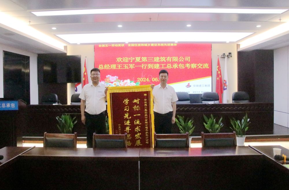 寧夏第三建筑有限公司一行參觀安徽建工集團(tuán)文化展廳,向建工總承包贈(zèng)送“學(xué)習(xí)先進(jìn)尋思路 對(duì)標(biāo)一流謀發(fā)展”錦旗。雙方對(duì)口部門圍繞企業(yè)運(yùn)行、項(xiàng)目管理、內(nèi)控治理、人才培養(yǎng)等深入交流,并到安徽建工合肥新橋國(guó)際機(jī)場(chǎng)T2航站樓、淮南壽縣一中、長(zhǎng)豐縣崗集鎮(zhèn)金明花園等項(xiàng)目實(shí)地觀摩。