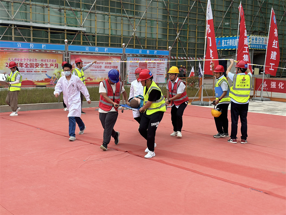 演練現(xiàn)場(chǎng)氣氛緊張而有序,由項(xiàng)目管理人員組成的演練小組迅速進(jìn)入角色。隨著模擬起重傷害事故的發(fā)生,現(xiàn)場(chǎng)管理人員第一時(shí)間向應(yīng)急領(lǐng)導(dǎo)小組總指揮長(zhǎng)報(bào)告事故,警報(bào)聲即刻響起,應(yīng)急程序隨即啟動(dòng),各救援小組聞聲而動(dòng)。突擊搶險(xiǎn)組第一時(shí)間沖向現(xiàn)場(chǎng),停止作業(yè)、疏散人員、清理現(xiàn)場(chǎng)障礙物,防止事故擴(kuò)大化;應(yīng)急救援組緊隨其后,熟練地采取應(yīng)急措施,爭(zhēng)分奪秒地營(yíng)救“受傷人員”;醫(yī)療救護(hù)組攜帶急救設(shè)備,對(duì)“傷者”進(jìn)行緊急救治和初步處理;綜合協(xié)調(diào)組迅速拉起警戒線,設(shè)置警示區(qū),維持現(xiàn)場(chǎng)秩序;通訊聯(lián)絡(luò)組則保持信息暢通,迅速聯(lián)系119、120,及時(shí)傳達(dá)指令和反饋情況。傷者成功獲救并被及時(shí)送往醫(yī)院治療,救援任務(wù)圓滿完成,應(yīng)急響應(yīng)宣布終止。