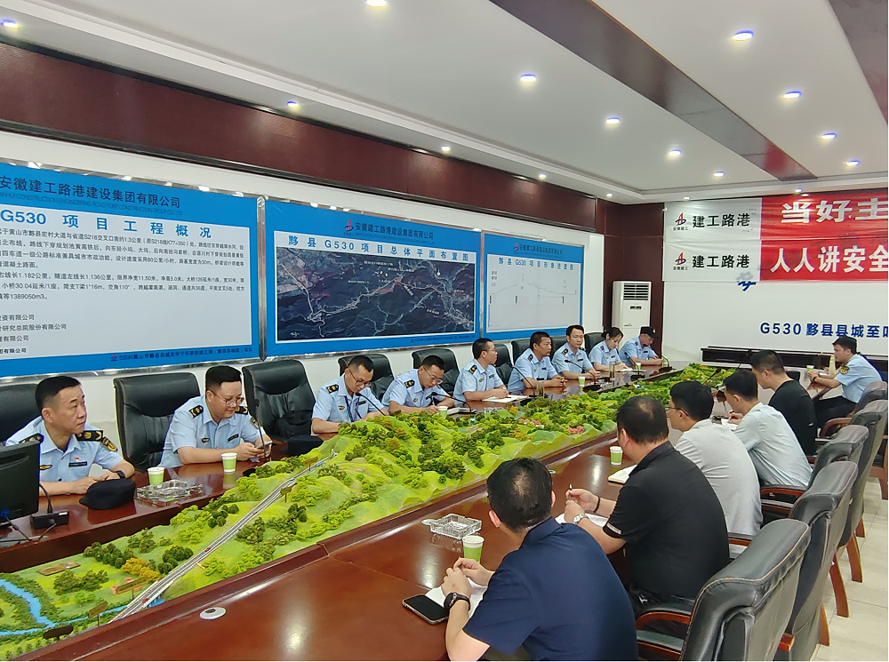 7月9日,黃山市交通運(yùn)輸綜合行政執(zhí)法支隊(duì)副大隊(duì)長(zhǎng)汪永鋒率隊(duì)赴建工投資黟縣G530項(xiàng)目開(kāi)展觀摩交流學(xué)習(xí)活動(dòng)。項(xiàng)目公司、總監(jiān)辦、中心試驗(yàn)室、項(xiàng)目部相關(guān)人員參加活動(dòng)。