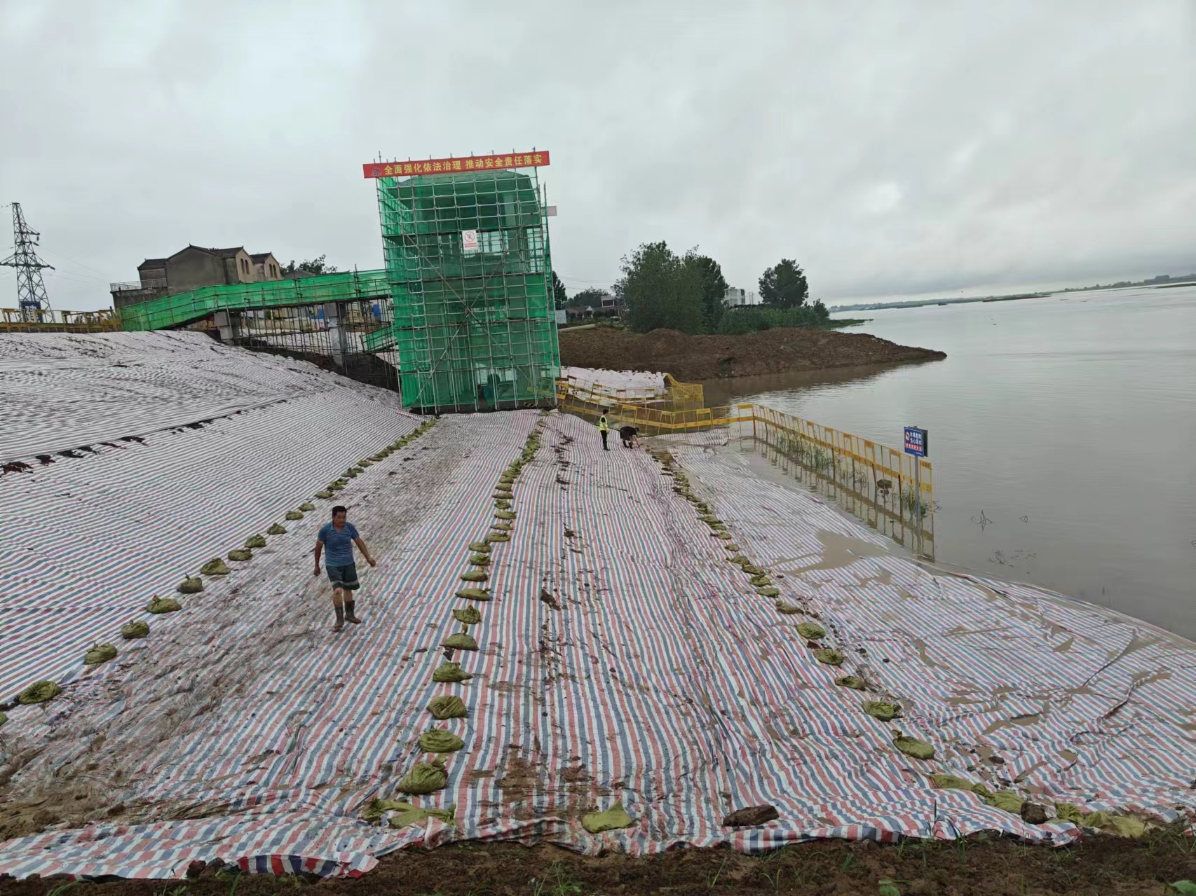 為切實(shí)做好降雨防范應(yīng)對(duì)工作,項(xiàng)目聞“汛”動(dòng),按照防汛演練方案,逐步開展防汛保障工作。7月初,項(xiàng)目安排專人實(shí)行防汛值班和巡檢制度,每日匯報(bào)降雨和堤壩情況。7月12日,降雨量持續(xù)增加,曾臺(tái)排灌站周邊堤壩隨時(shí)都有發(fā)生滑坡的情況。經(jīng)過項(xiàng)目部科學(xué)研判,立即組織人員鋪設(shè)花雨布,利用提前準(zhǔn)備的防汛物資,將碎石裝進(jìn)編織袋,運(yùn)至堤壩坡面,有效防止水流侵蝕,保護(hù)堤壩的穩(wěn)定性,防止險(xiǎn)情發(fā)生。