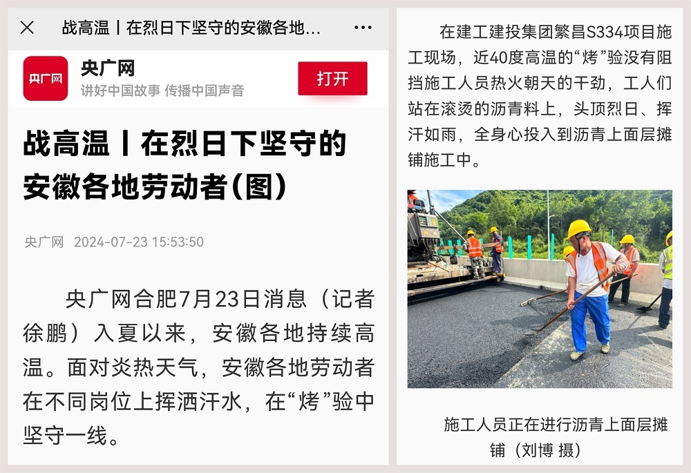 報(bào)道中指出:在建工建投集團(tuán)繁昌S334項(xiàng)目施工現(xiàn)場,近40度高溫的“烤”驗(yàn)沒有阻擋施工人員熱火朝天的干勁,工人們站在滾燙的瀝青料上,頭頂烈日、揮汗如雨,全身心投入到瀝青上面層攤鋪施工中。