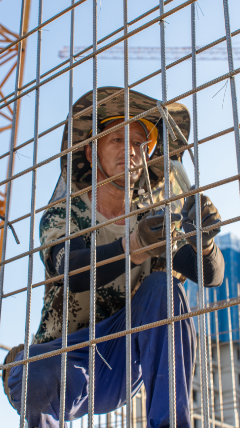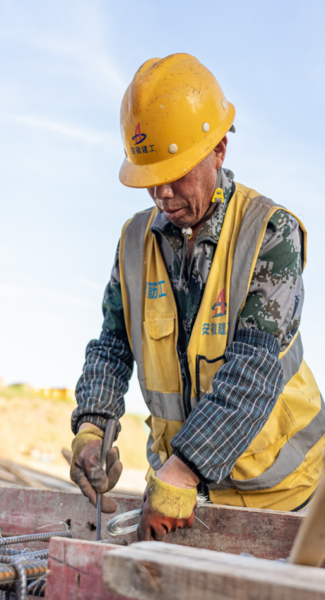 暴曬下的鋼筋表面十分燙手,站在邊上都能感覺到熱度。來自六安的程振合和李中俊作為鋼筋工能手正頭頂烈日,在鋼筋叢林中“穿針引線”。李中俊一手固定住鋼筋,一手熟練地用工具把鋼筋綁扎好。這樣的動(dòng)作,他每天都要重復(fù)無數(shù)次。