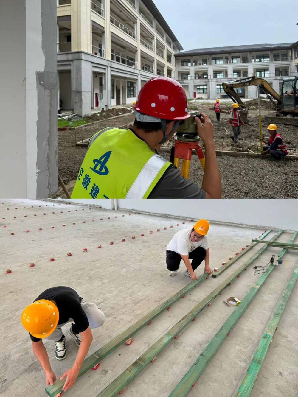 圖為4號(hào)樓內(nèi)庭院鋪裝基層碎石整平、室內(nèi)體育場(chǎng)運(yùn)動(dòng)木地板龍骨搭建