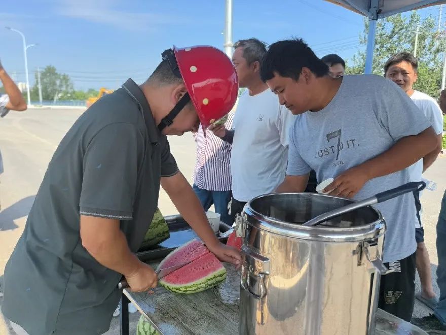 為保障施工人員的身體健康和施工安全,項(xiàng)目部采取了一系列防暑降溫措施:合理調(diào)整施工時(shí)間,避開(kāi)高溫時(shí)段作業(yè);在施工現(xiàn)場(chǎng)設(shè)置遮陽(yáng)棚,供工作人員休息乘涼;每日為工人提供充足的飲用水和綠豆湯等防暑飲品及藥品。