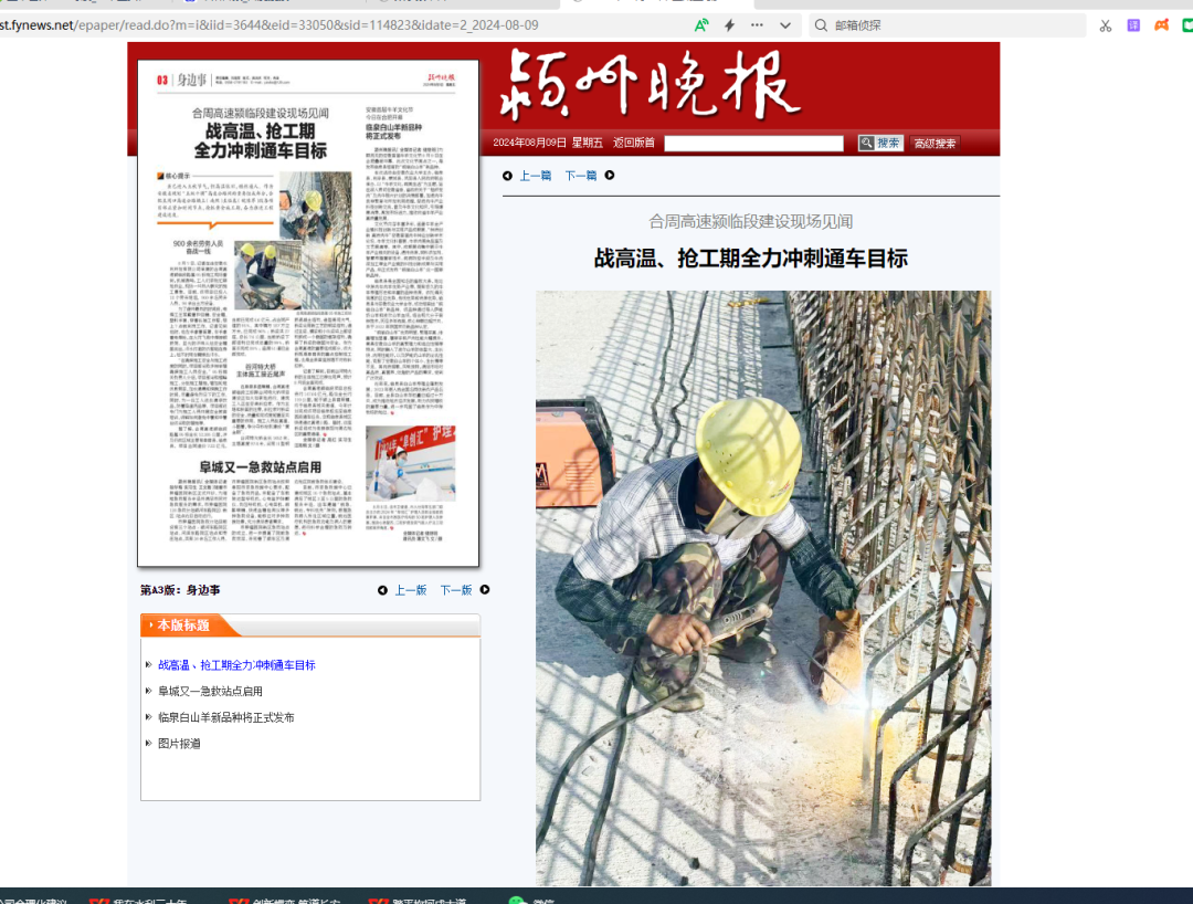 8月9日,潁州晚報以《戰(zhàn)高溫、搶工期全力沖刺通車目標(biāo)》為題,報道安徽水利合周高速穎臨段路基05標(biāo)項目攻堅克難,全力沖刺通車節(jié)點目標(biāo),全文如下: