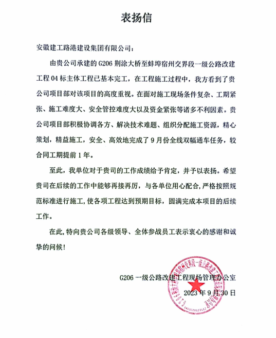 一是目標(biāo)明確,齊抓共管推進度。項目立足工程點多面廣、戰(zhàn)線長、交通組織壓力大的特點,全周期精細部署工程建設(shè)、安全、質(zhì)量、合同、物資等管理工作。同時,對關(guān)鍵工程進行工期和進度倒排,并不定期召開項目總結(jié)會,及時排查存在問題并制定趕工措施。其中,針對土源稀缺問題,項目安排專人跑市場,積極尋土、備土,進而順利完成了土方施工任務(wù)。最終,2023年1月16日左幅順利通車,同年9月底實現(xiàn)雙幅順利通車目標(biāo),較合同工期提前一年,并獲得了業(yè)主的表揚信。2024年6月份項目主體工程全部完工,比計劃工期提前5個月交工。