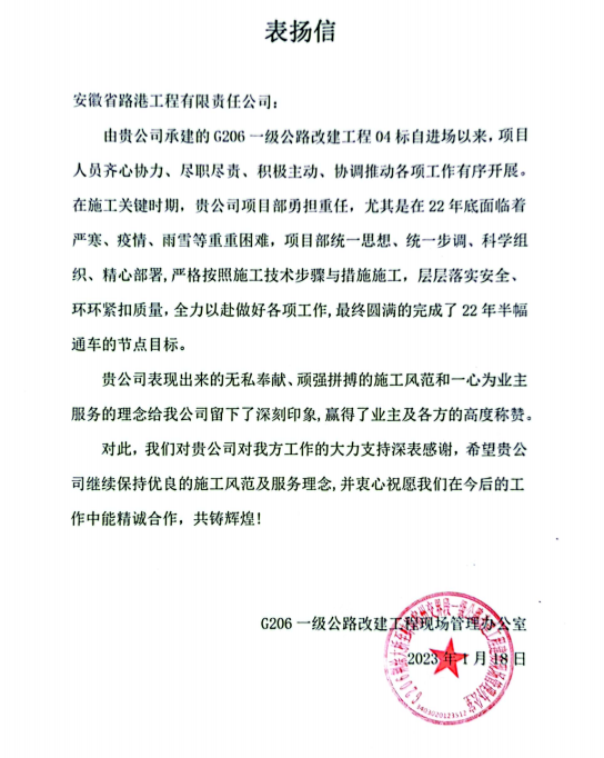 近日,G206荊涂大橋至蚌埠宿州交界段一級公路改建工程04標(biāo)項目順利通過交工驗收。