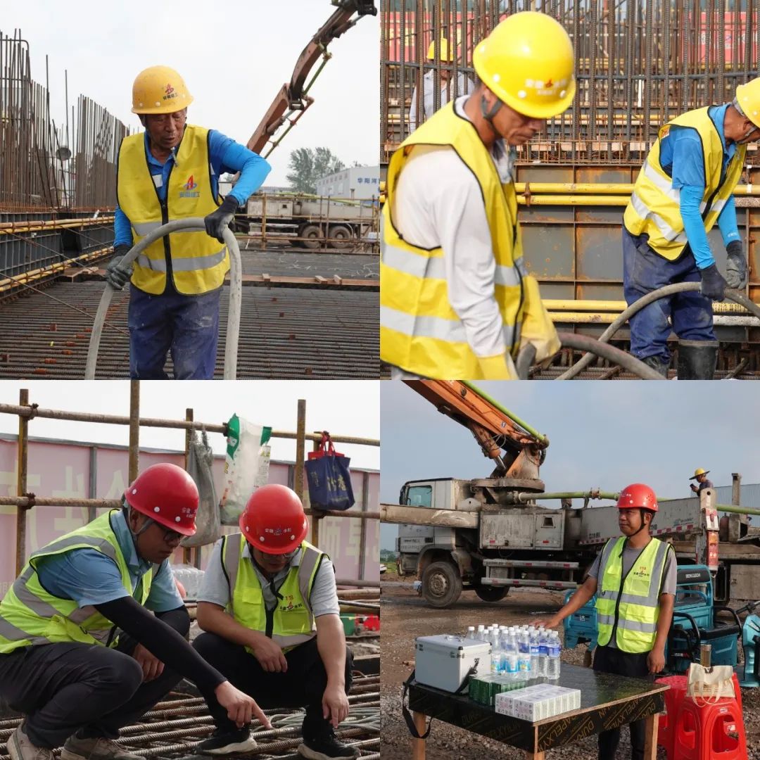 面對高溫天氣,項(xiàng)目部制定專項(xiàng)施工方案,澆筑前在底板模板內(nèi)埋設(shè)冷卻水管,澆筑中向混凝土攪拌站按時(shí)間段投入冰塊,料倉內(nèi)砂石料灑水降溫,澆筑后通水降溫等舉措,有效控制混凝土入模溫度及前期升溫,避免溫度裂縫的產(chǎn)生。同時(shí),在現(xiàn)場設(shè)立防暑物資攤位,向一線作業(yè)人員提供藥品、冰水,保障施工人員身體健康和施工安全。