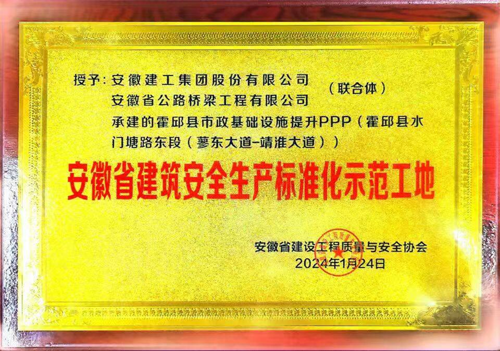 近日,建工投資霍邱PPP項(xiàng)目水門塘路東段(蓼東大道-靖淮大道)工程被安徽省建設(shè)工程質(zhì)量與安全協(xié)會(huì)授予“安徽省建筑安全生產(chǎn)標(biāo)準(zhǔn)化示范工地”榮譽(yù)稱號(hào)。
