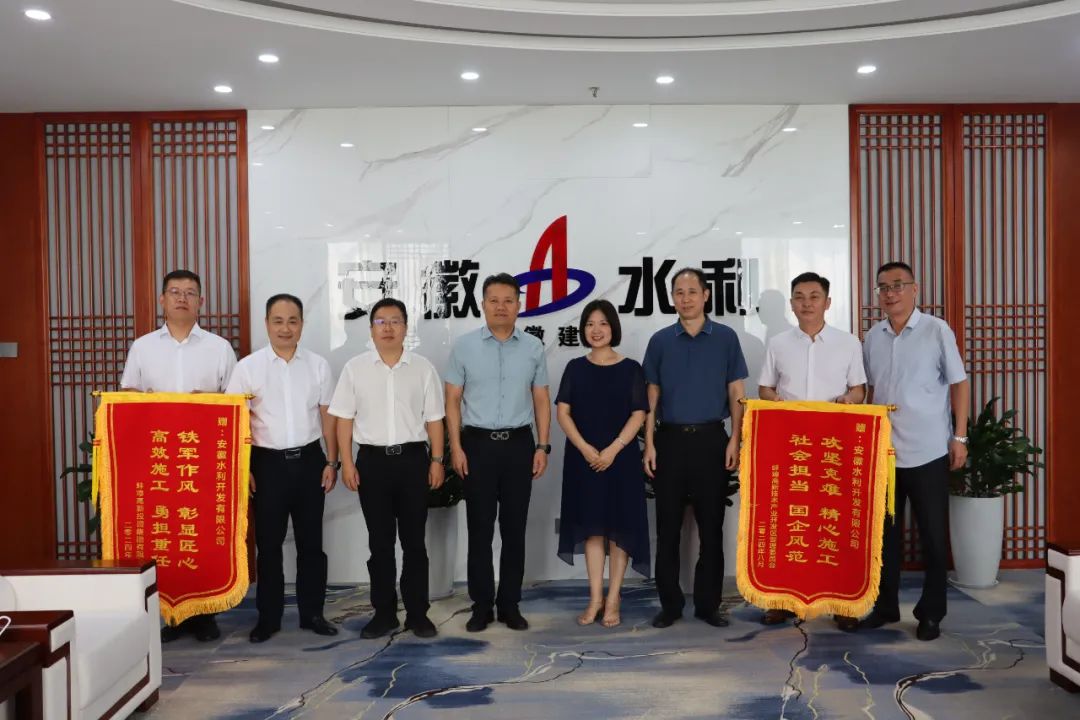 9月5日,蚌埠市高新區(qū)社會(huì)事業(yè)局黨委書(shū)記、局長(zhǎng)錢玉,蚌埠高新投資集團(tuán)有限公司黨委書(shū)記、董事長(zhǎng)李德旺,副總經(jīng)理陳輝一行來(lái)到安徽水利,將兩面錦旗送到建工股份副總經(jīng)理、安徽水利黨委書(shū)記、董事長(zhǎng)張鍵手中,并就進(jìn)一步深化合作開(kāi)展會(huì)談交流。