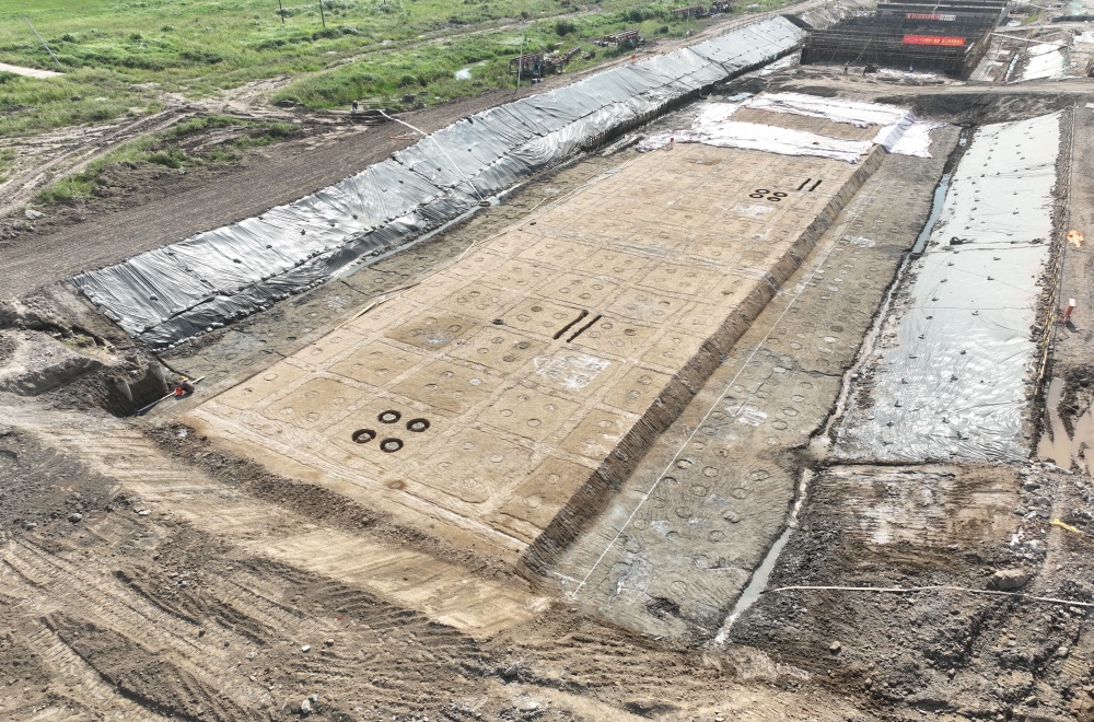 程營進(jìn)洪閘地基處理的水泥土攪拌樁部分由三種樁型組成,分別為格柵樁,散樁以及防滲墻,樁徑均為600mm。本次驗收的第十六聯(lián)攪拌樁數(shù)量為982根(其中格柵樁633根,散樁203根,防滲墻146根),地基處理于2024年1月20日進(jìn)場施工,6月17日完成水泥土攪拌樁施工,8月17日開始土方開挖,8月30日完成土方開挖。第十七聯(lián)攪拌樁數(shù)量為974根(其中格柵樁633根,散樁195根,防滲墻146根),地基處理于2023年12月9日進(jìn)場施工,2024年1月18日完成水泥土攪拌樁施工,8月17日開始土方開挖,8月30日完成土方開挖。