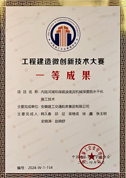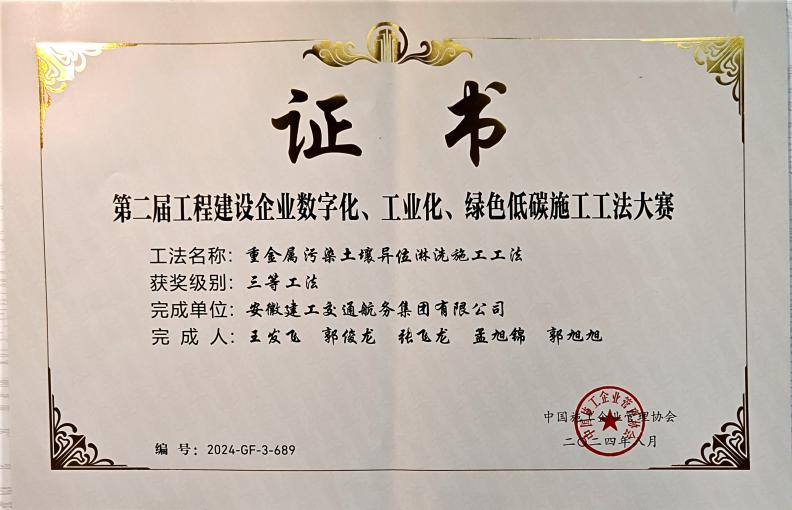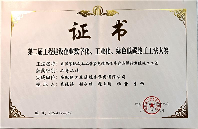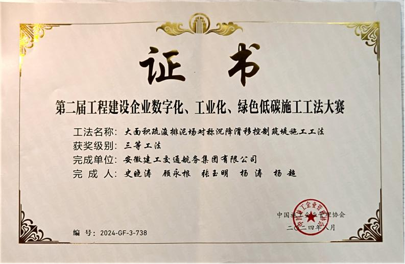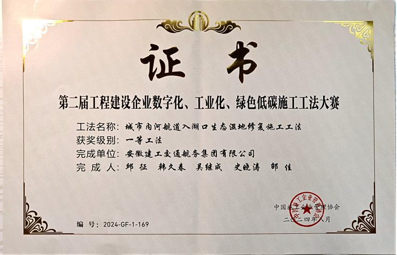 在工程建設(shè)企業(yè)“數(shù)字化、工業(yè)化、綠色低碳”施工工法大賽中,公司申報(bào)的“城市內(nèi)河航道入湖口生態(tài)濕地修復(fù)施工工法”、“自浮裝配式土工管袋充灌操作平臺(tái)與隔污系統(tǒng)施工工法”、“重金屬污染土壤異位淋洗施工工法”、“大面積疏浚排泥場(chǎng)對(duì)稱沉降滑移控制筑堤施工工法”分別榮獲一等獎(jiǎng)、二等獎(jiǎng)、三等獎(jiǎng)。