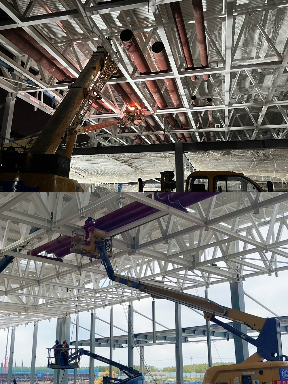 該項目本階段正在進行各車間直徑DN700、DN800的空調(diào)冷凍水管道吊裝搶工。為了能早日完成空調(diào)冷凍水管道吊裝的工程節(jié)點目標,項目管理人員以工期進度為主線,多次召開技術商討會,合理優(yōu)化吊裝施工方案,全體員工實行24小時輪班工作制,夜晚輪流值班,晝夜奮戰(zhàn)、奮勇爭先,發(fā)起項目加速建設的“最強攻勢”。