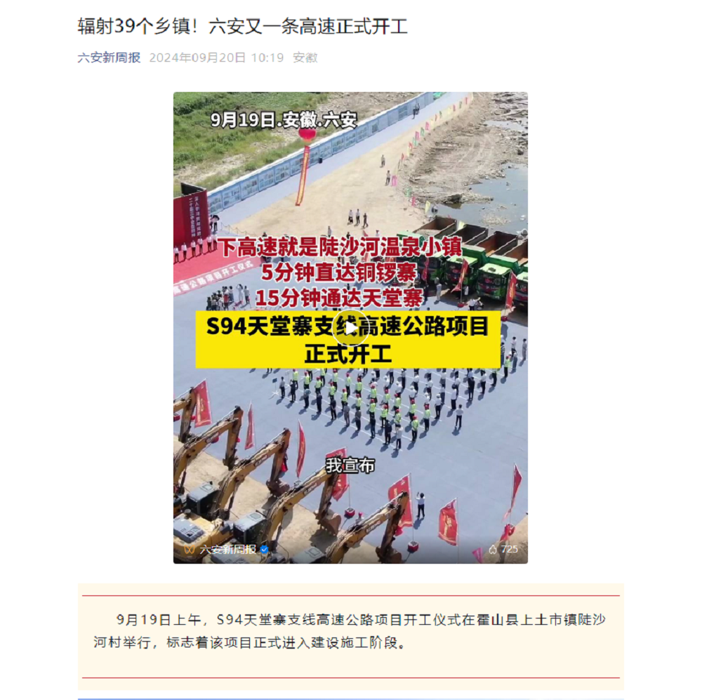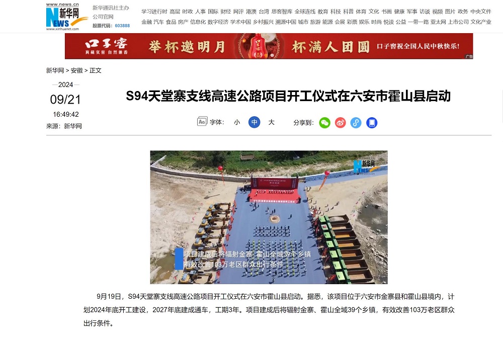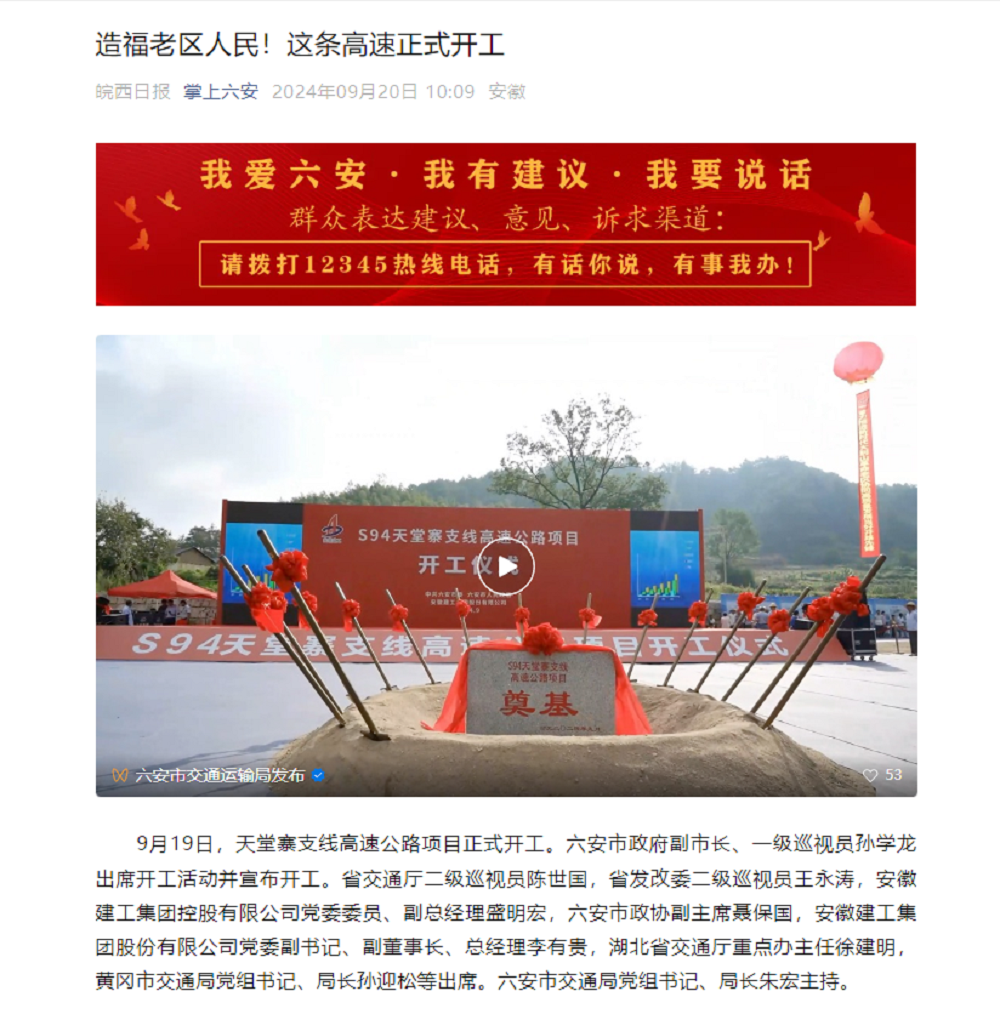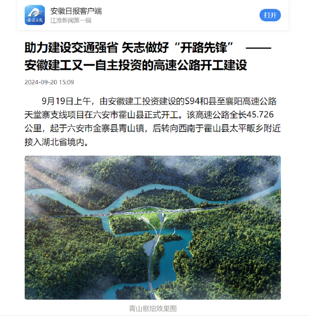 9月19日上午,由安徽建工投資建設(shè)的S94和縣至襄陽(yáng)高速公路天堂寨支線項(xiàng)目在六安市霍山縣舉辦開工儀式,新華網(wǎng)、人民網(wǎng)、安徽日?qǐng)?bào)、皖西日?qǐng)?bào)等主流媒體紛紛聚焦項(xiàng)目開工。