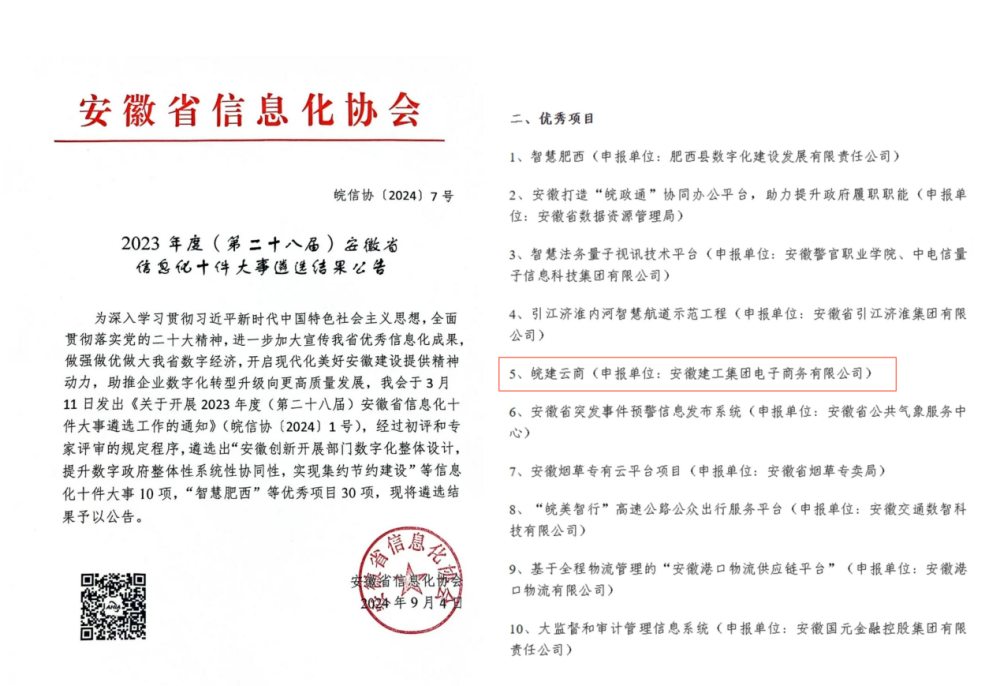 近日,安徽省信息化協(xié)會(huì)公布了2023年度(第二十八屆)安徽省信息化十件大事遴選結(jié)果,由建工商貿(mào)物流電商公司申報(bào)的“皖建云商”經(jīng)過初評(píng)和專家評(píng)審,成功入選2023年度安徽省信息化十件大事優(yōu)秀項(xiàng)目。