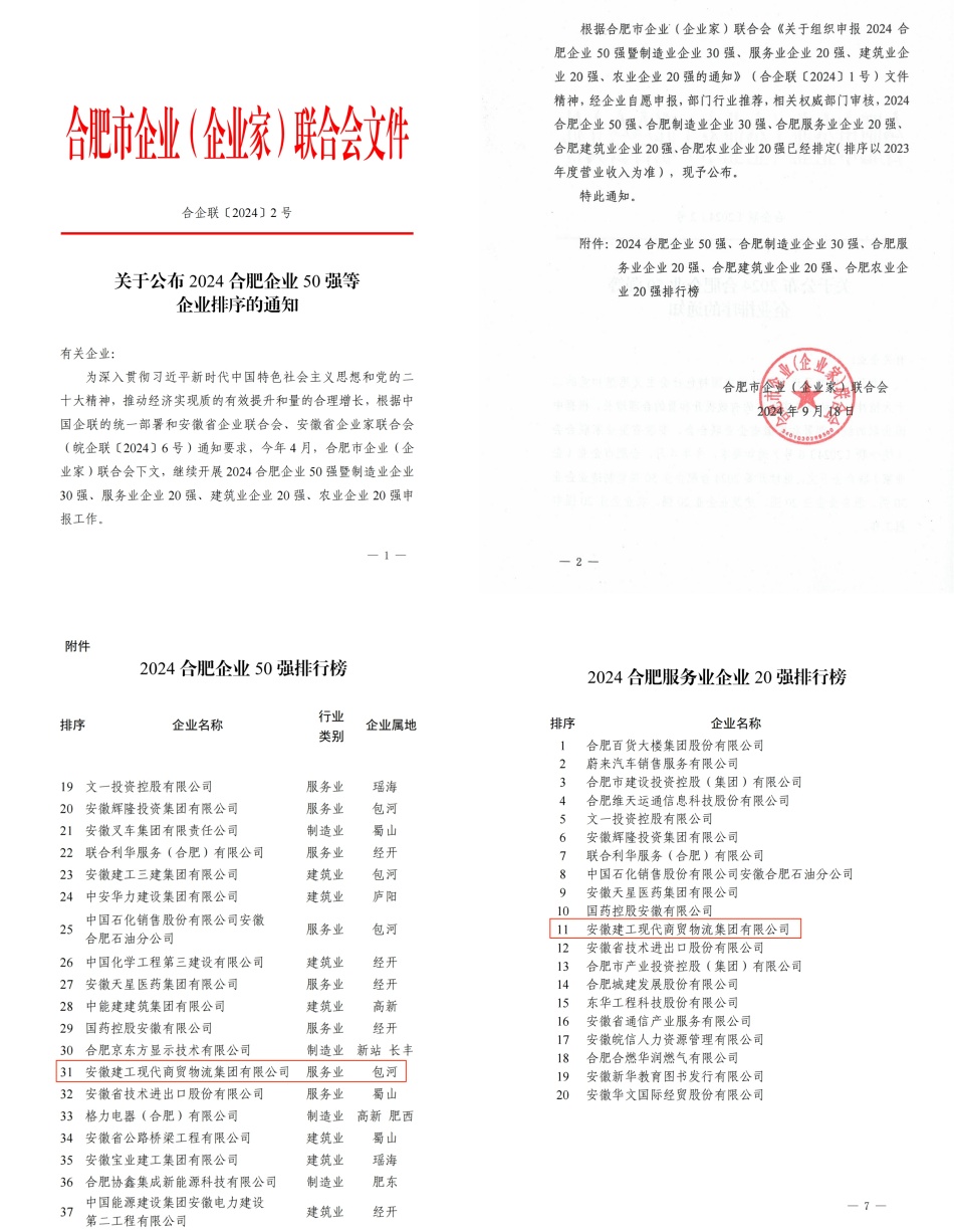 近日,合肥市企業(yè)(企業(yè)家)聯(lián)合會發(fā)布了2024合肥企業(yè)50強(qiáng)、合肥服務(wù)業(yè)企業(yè)20強(qiáng)榜單,建工商貿(mào)物流連續(xù)四年入選,分別位列第31位和第11位。