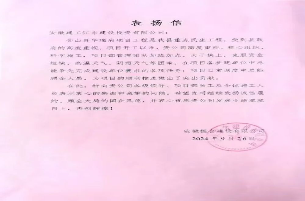 9月26日,安徽建工江東建投收到業(yè)主感謝信,信中對江東建投高度重視、精心組織含山縣華瑞府項目科學施工表示感謝,對項目團隊迎難而上、全力以赴、率先高效完成建設(shè)任務(wù)給予高度肯定。