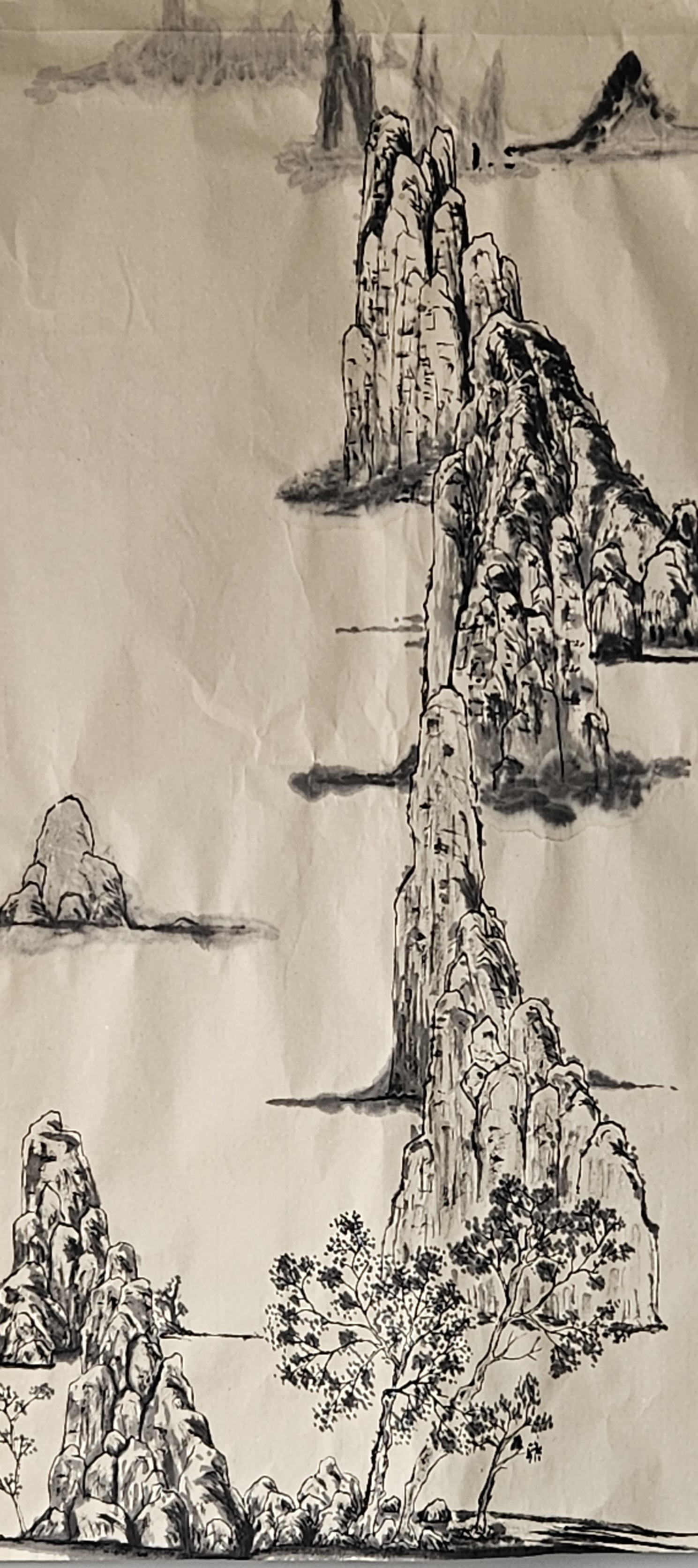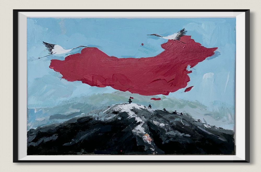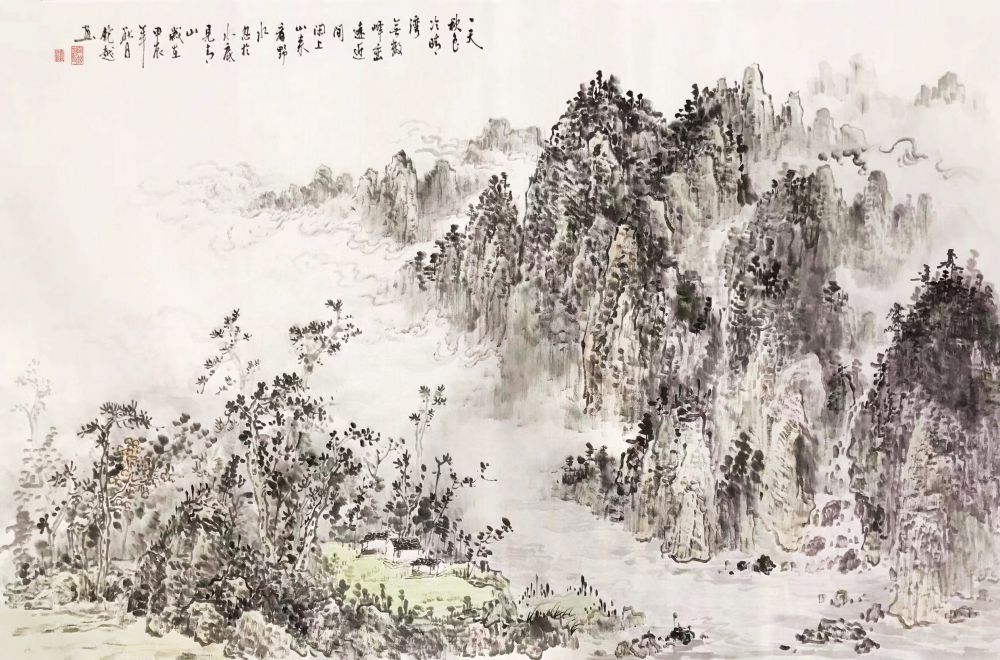 遠(yuǎn)山含黛,層巒疊嶂,輕柔筆觸,勾勒出連綿山脈,宛如祖國(guó)脊梁,堅(jiān)韌挺拔;淡雅墨色,潺潺流溢于山間河流,穿梭群峰,恰似母親秀發(fā),柔美飄逸,將對(duì)祖國(guó)母親的熱愛與敬仰,融入一筆一劃。