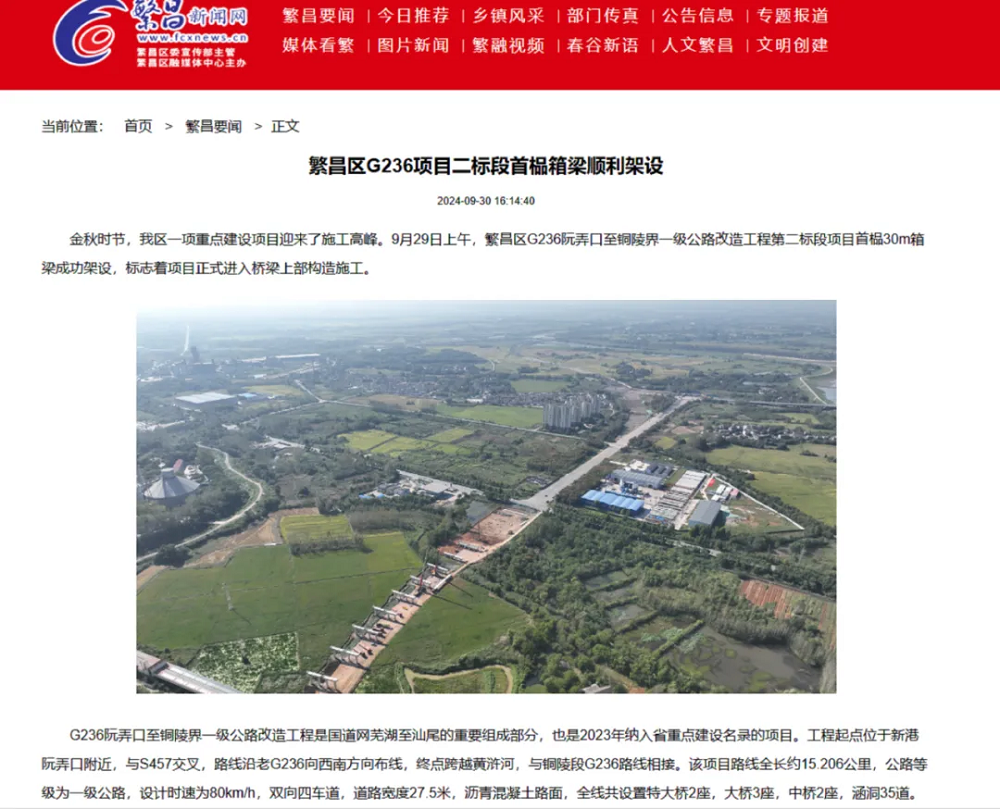 近日,“繁昌新聞網(wǎng)”、“繁昌發(fā)布”視頻號報(bào)道由建工建投集團(tuán)承建的繁昌區(qū)G236項(xiàng)目二標(biāo)段首榀30m箱梁順利架設(shè)。