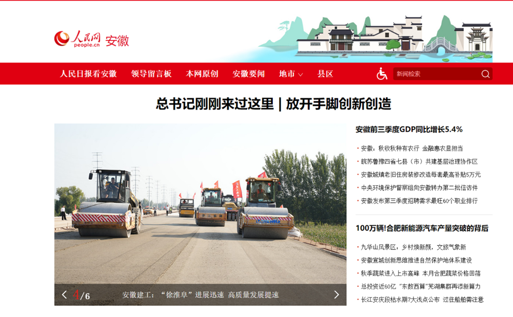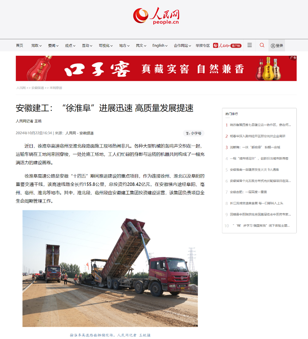 近日,人民網(wǎng)安徽頻道重點報道了安徽建工投資建設的徐淮阜高速項目。