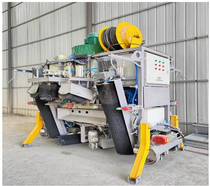 為此,公司創(chuàng)新運用了一種能夠適配不同型號箱梁模板的智能打磨機。該設(shè)備集成自行程、全液壓、全自動、自吸塵、自噴涂于一體,通過傳感器、控制器與專用軟件相結(jié)合,可分析處理數(shù)據(jù)來控制打磨輥的轉(zhuǎn)速、壓力、移動速度等,還能自動控制臂架姿態(tài)。相比傳統(tǒng)人工作業(yè),新型打磨設(shè)備大大提高了效率,減少了人力需求,解決了作業(yè)人員面臨的高溫、粉塵、易滑落致傷等問題。