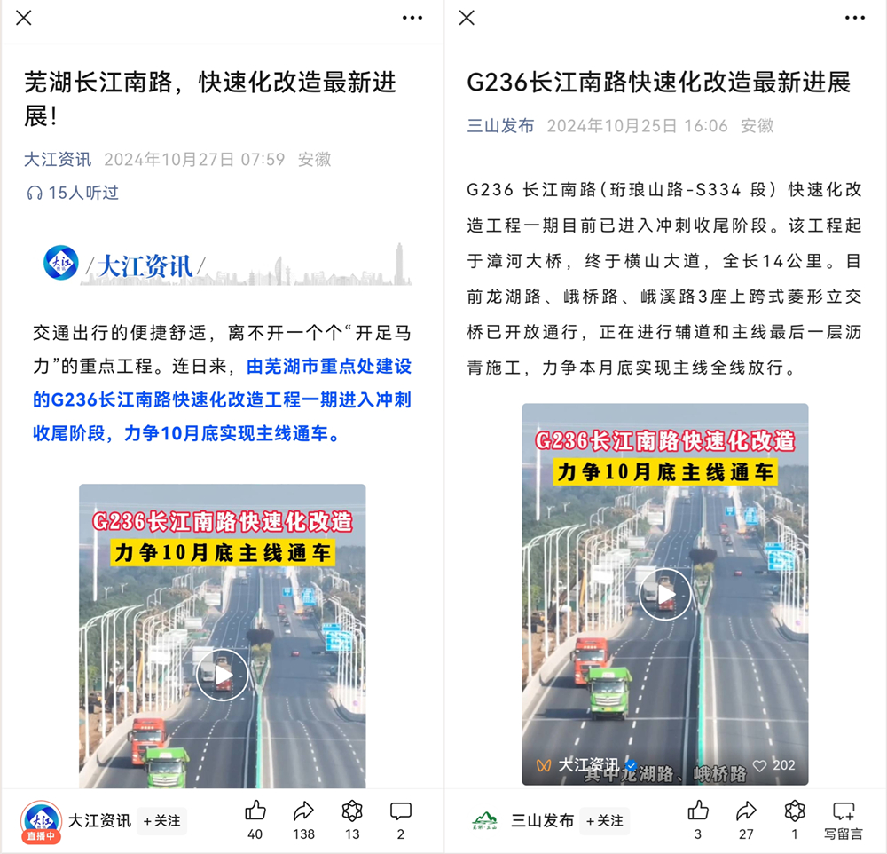 G236長(zhǎng)江南路快速化改造工程一期項(xiàng)目起于漳河大橋,終于橫山大道,改造工程全長(zhǎng)14公里,主要包含龍湖路、峨橋路、蓮花湖路以及峨溪路4座上跨式菱形立交橋,橋下新建道路以及一般路段的快車道路面改造等。工程建成后,將順接S334繁昌快速化通道,蕪湖至三山、繁昌將更便捷。