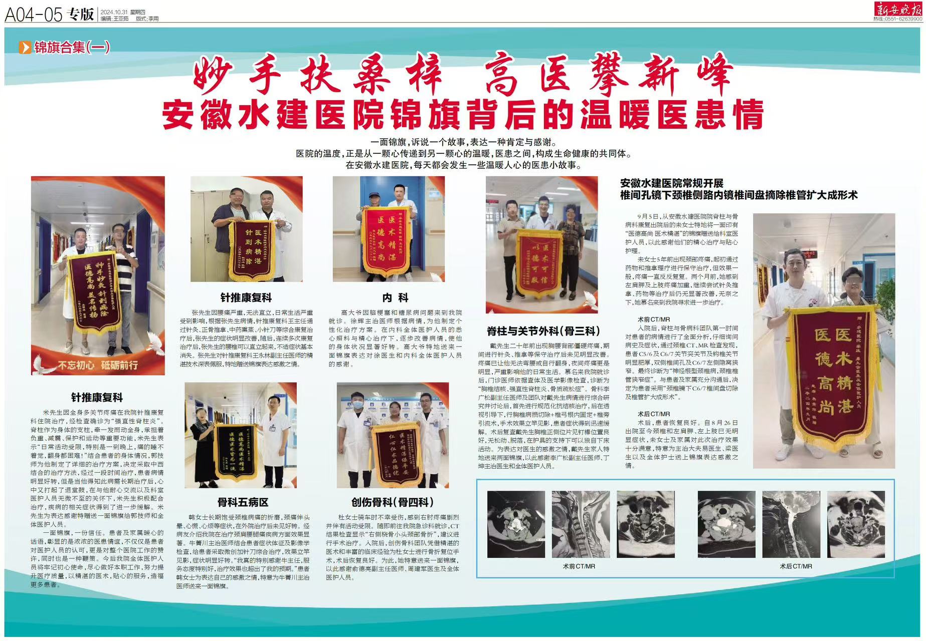 10月31日,新安晚報(bào)刊登了水建醫(yī)院《妙手扶桑梓 高醫(yī)攀新峰》專題報(bào)道,文章圍繞錦旗背后的溫暖醫(yī)患情進(jìn)行了深情講述。