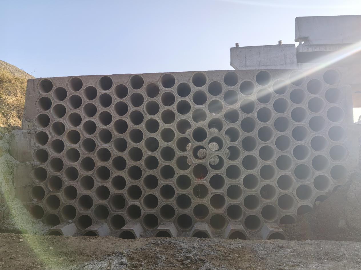 項目在施工過程中積極參與科研創(chuàng)新,先后進(jìn)行了蜂窩路基的結(jié)構(gòu)、材料與施工關(guān)鍵技術(shù)課題的研究和坡改平生態(tài)護(hù)坡新工藝。蜂窩路基結(jié)構(gòu)的研發(fā)既解決了土源問題,又推進(jìn)了固廢資源化。坡改平生態(tài)護(hù)坡研發(fā)出了一種新型生態(tài)護(hù)坡技術(shù),使其既具有老式護(hù)坡磚施工簡單、工程造價低的優(yōu)點,又能克服水土保持效果差的弊端。通過多方案的比選論證,提出新型的 “坡改平”生態(tài)護(hù)坡磚技術(shù)(以下稱 “新型護(hù)坡磚”),利用“坡改平”護(hù)坡磚的特殊結(jié)構(gòu),將整個坡面分解為一個個 “小平面”,以“小平面”土體的穩(wěn)定,實現(xiàn)整個坡面的穩(wěn)定,從而解決坡面土壤流失問題。