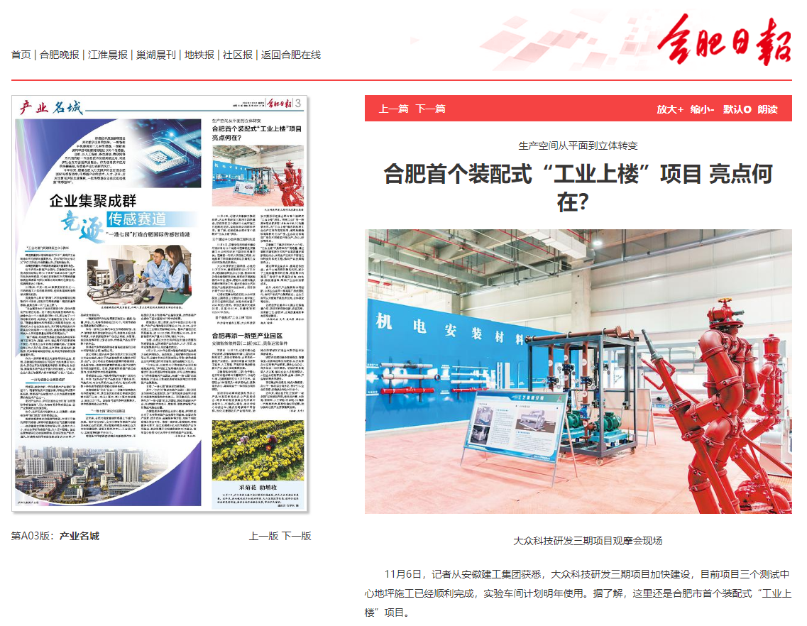 近日,合肥日?qǐng)?bào)、合肥晚報(bào)等主流媒體聚焦報(bào)道建工三建承建的合肥市首個(gè)裝配式“工業(yè)上樓”項(xiàng)目——大眾科技研發(fā)三期項(xiàng)目亮點(diǎn)及最新進(jìn)展,受到廣泛關(guān)注。