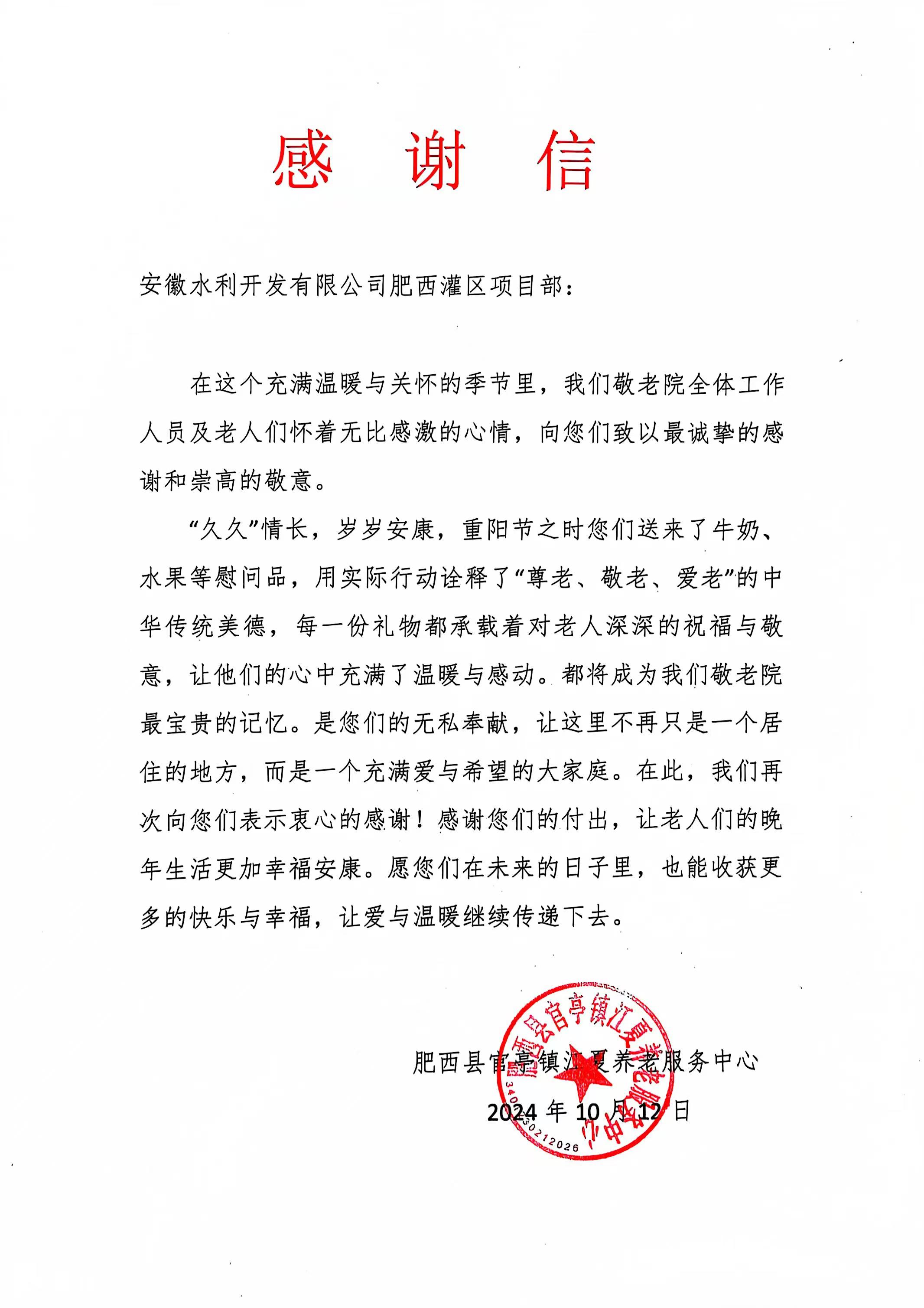 安徽水利收到一封來(lái)自養(yǎng)老服務(wù)中心的感謝信