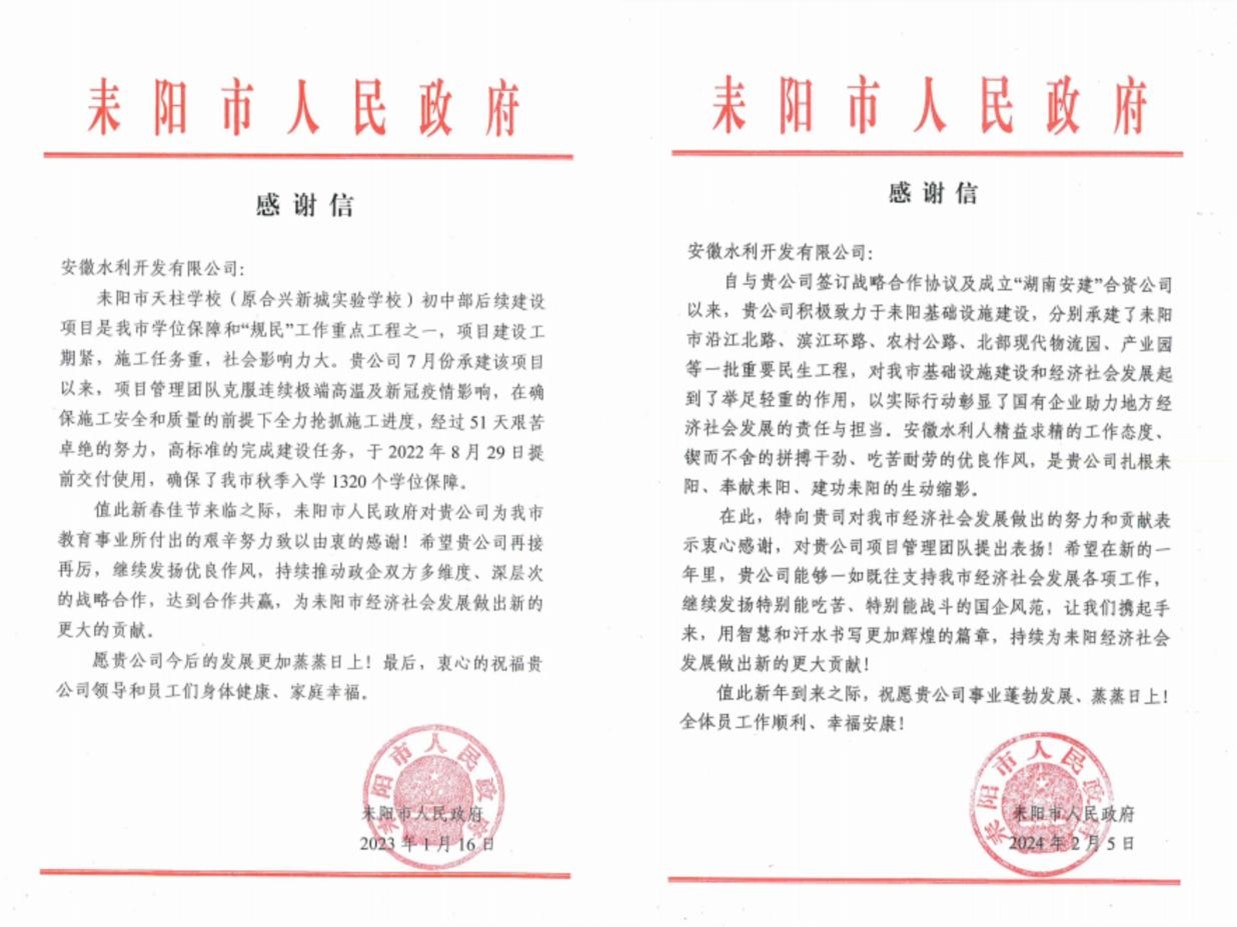 與客戶同心,合作共贏。2024年,安徽水利南方分公司積極融入地方發(fā)展大局,推動耒陽市委市政府與安徽水利高層開展互動交流6次,建立起良好互信關系。在此期間,公司還分別與耒陽市人民政府、耒陽經(jīng)濟開發(fā)區(qū)管理委員會簽訂了戰(zhàn)略合作框架協(xié)議,與耒陽市城市和農(nóng)村建設投資集團有限公司合資成立了湖南安建建設開發(fā)有限公司,建立了政企合作的紐帶。合資公司的成立為助力耒陽基礎設施建設,助推耒陽經(jīng)濟發(fā)展,帶動當?shù)厝丝诰蜆I(yè),增加地方財政稅收等方面貢獻了“湖南安建”的力量,并順利取得建筑工程施工總承包貳級和市政公用工程施工總承包貳級資質(zhì)資質(zhì)。
