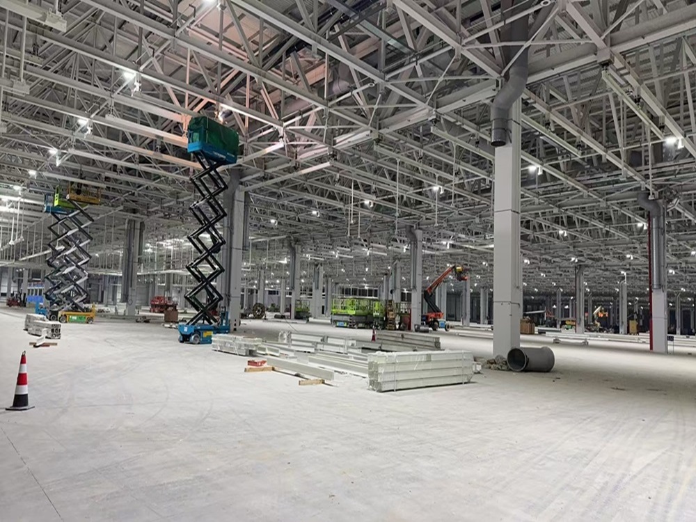 截至目前,車間一B區(qū)焊裝車間內(nèi)的給排水管道、消防管道、暖通風(fēng)管、空調(diào)水管、虹吸雨水、630循環(huán)水管均全部安裝完成,已全面進入試壓階段。正在進行車間一沖壓車間及QA樓安裝工作,電氣系統(tǒng)進入電纜放線安裝階段,暖通系統(tǒng)進入風(fēng)口風(fēng)閥安裝階段。