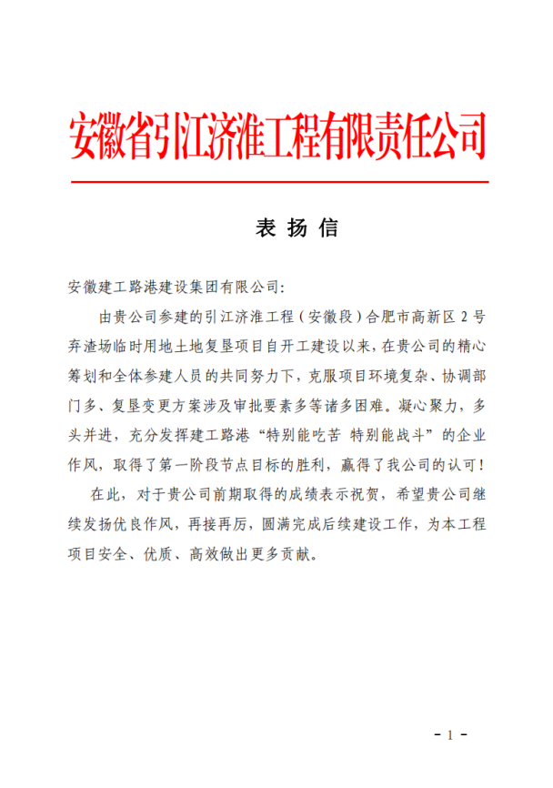 日前,建工路港引江濟(jì)淮2號(hào)棄渣場(chǎng)復(fù)墾項(xiàng)目收到安徽省引江濟(jì)淮工程有限責(zé)任公司的表?yè)P(yáng)信。
