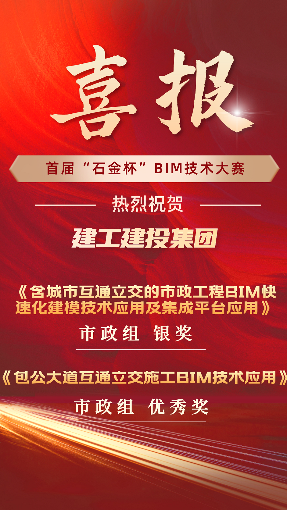 12月15日,中國(guó)交通運(yùn)輸協(xié)會(huì)主辦的首屆“石金杯”BIM技術(shù)大賽在西安圓滿落幕,建工建投集團(tuán)兩項(xiàng)BIM技術(shù)成果獲獎(jiǎng)。其中《含城市互通立交的市政工程BIM快速化建模技術(shù)應(yīng)用及集成平臺(tái)應(yīng)用》榮獲“市政組”銀獎(jiǎng),《包公大道互通立交施工BIM技術(shù)應(yīng)用》榮獲“市政組”優(yōu)秀獎(jiǎng)。